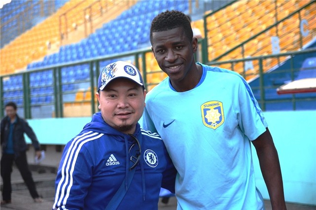 Ramires chụp hình lưu niệm với một CĐV Chelsea nổi tiếng tại Việt Nam có mặt tại sân Gò Đậu chiều 22/2.