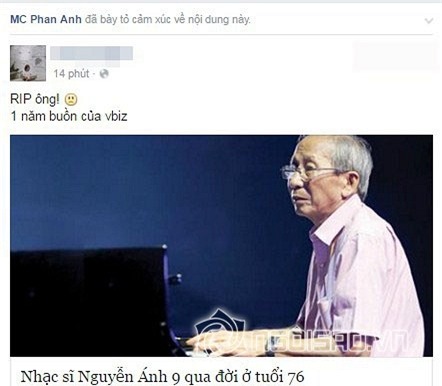 Sáng ngày 14/4, nhạc sĩ Nguyễn Ánh 9 đã hôn mê trở lại. Mặc dù được gia đình và các bác sĩ tận tình chăm sóc nhưng nhạc sĩ Nguyễn Ánh 9 không thể qua khỏi. Ông trút hơi thở cuối cùng vào trưa 14/4 tại Bệnh viện ĐH Y Dược (TP.HCM), thọ 76 tuổi. Trước sự ra đi của vị nhạc sĩ đáng kính, rất nhiều sao Việt đã đau lòng và xót xa chia buồn cùng gia đình ông.