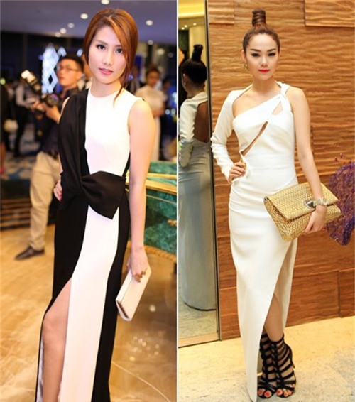 Diễm My 9X già dặn và như bị "nuốt chửng" trong chiếc váy xẻ phom dáng quá cứng cáp, trong khi Minh Hằng diện một chiếc váy xẻ cut-out sexy nhưng kém sang vì chưa thực sự vừa vặn