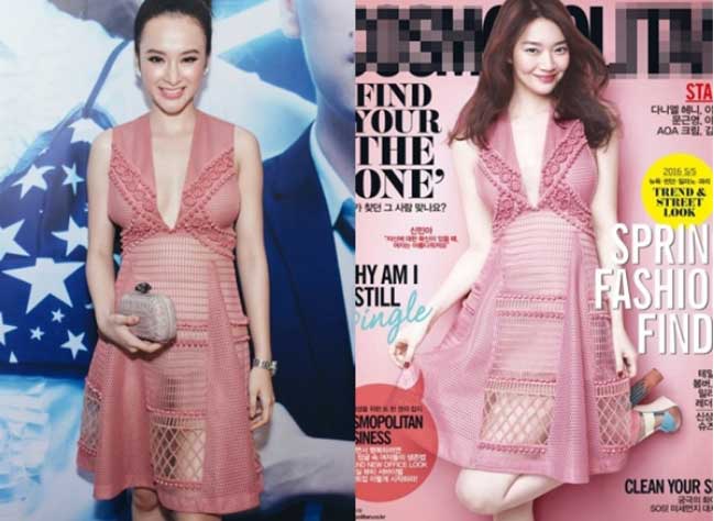 Với một bộ váy xẻ ngực sâu và có những khoảng ren xuyên thấu táo bạo thế này thì vóc dáng mảnh mai của Shin Min Ah có phần phù hợp hơn Angela Phương Trinh