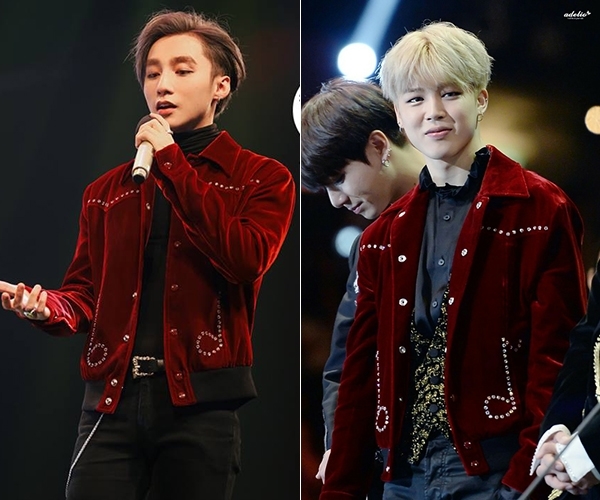 Với một chiếc áo quá nổi như bomber nhung đỏ này thì Sơn Tùng tiết chế với áo cổ lọ đen, quần đen, thắt lưng đen hợp lý hơn Ji Min (BTS) là cái chắc