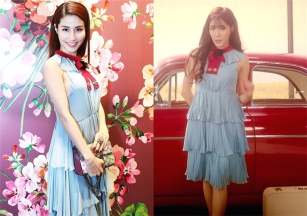 Với thiết kế màu xanh pastel, chất liệu rủ xếp tầng, cả Diễm My và Tiffany đều không tỏa sáng. Nếu như nữ diễn viên "Chạy đi rồi tính" có cách phối phụ kiện không phù hợp thì dường như dáng vóc của ngôi sao xứ Hàn lại quá khổ so với bộ cánh.