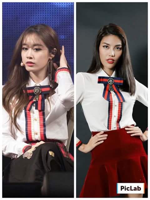 Lan Khuê và Jiyeon đụng hàng áo sơ mi bánh bèo có cài áo đồng bộ này nhưng khác biệt ở chỗ thành viên nhóm T-ara phối với chân váy caro và để tóc xoăn nhẹ, còn Hoa khôi áo dài lại để tóc thẳng và mặc váy nhung đỏ. Một bên trẻ trung, một bên quyền lực.