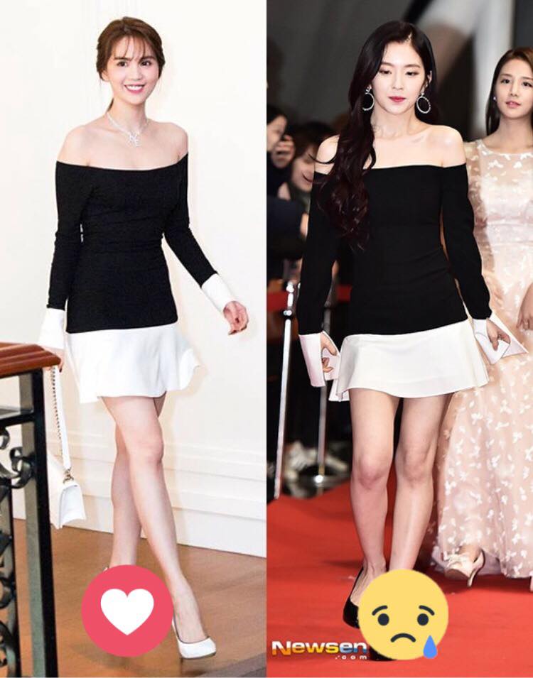 Ngọc Trinh diện váy đen trắng trễ vai, thiết kế tối giản. Kiểu váy này giống với chiếc váy từng được ca sĩ Irene nhóm nhạc Hàn - Red Velvet - diện lên thảm đỏ một sự kiện. Với thân hình dong dỏng, cả hai đều ghi điểm về phong cách thời trang.