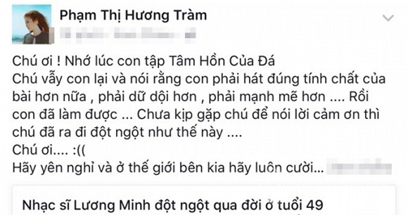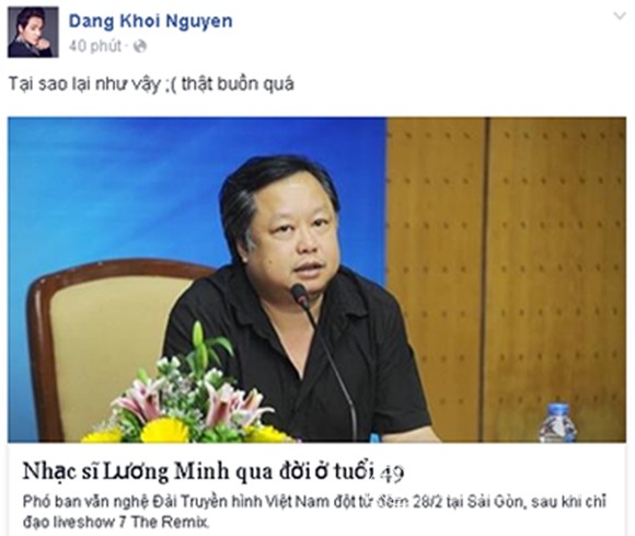 Ít ai có thể tin nổi đó là sự thật, bởi ngay tối hôm qua (28/2) - nhạc sĩ Lương Minh vẫn có mặt ở TP. HCM để chỉ đạo nghệ thuật cho chương trình The Remix liveshow thứ 7. Thông tin này đã được xác nhận và hàng loạt sao Việt xúc động rơi nước mắt trước sự mất mát quá lớn của làng nhạc Việt.