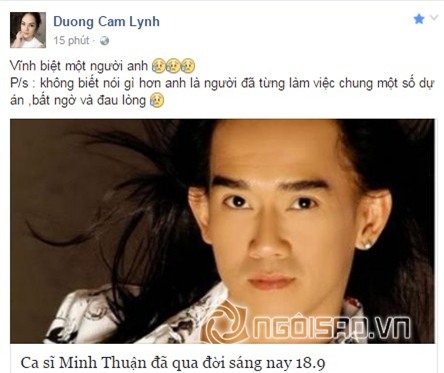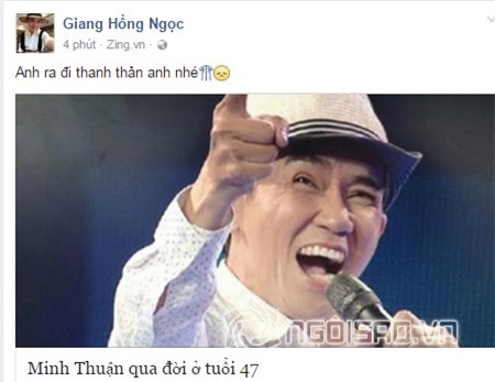 Thế nhưng, sau một thời gian chống chọi với căn bệnh ung thư phổi, ca sĩ Minh Thuận qua đời vào ngày 18/9. Trước sự ra đi của Minh Thuận, nhiều sao Việt đã lên tiếng chia buồn cùng gia đình nam ca sĩ. Ai cũng xót xa, đau lòng khi nghe tin Minh Thuận qua đời.