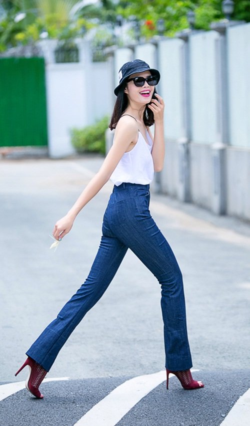 Quần ống vẩy cạp cao giúp kéo dài đôi chân, tạo cảm giác thân hình thon thả hơn - Trà Ngọc Hằng với trang phục dạo phố