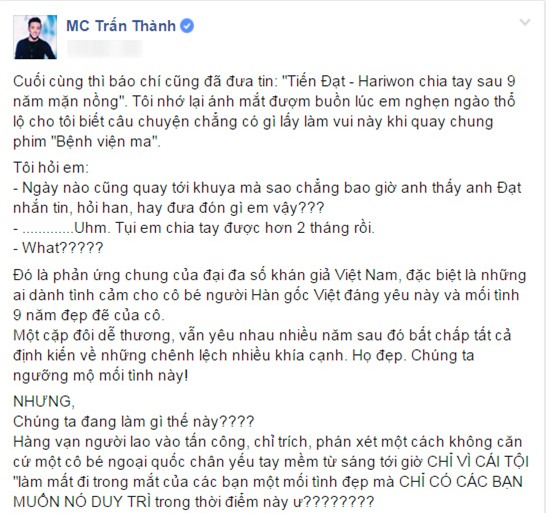 Ngay sau đó, Trấn Thành quyết định lên tiếng trên trang cá nhân để bênh vực "người tình tin đồn" của mình. Anh viết dòng trạng thái khá dài, mở đầu với việc mình đã biết câu chuyện này từ thời quay chung phim "Bệnh viện ma" với cô. Đồng thời, diễn viên hài tự hỏi rằng, khán giả đang làm gì mà lại tấn công, chỉ trích một cô gái ngoại quốc yếu đuối chỉ vì tội "làm mất đi trong mắt của các bạn một mối tình đẹp mà chỉ có các bạn muốn nó duy trì trong thời điểm này".