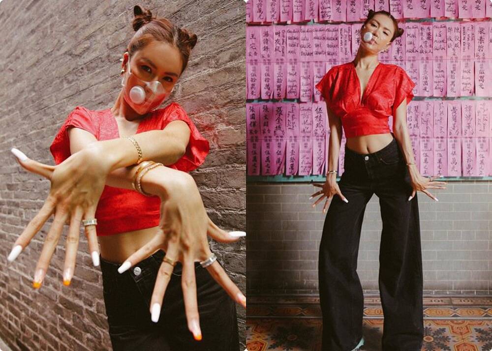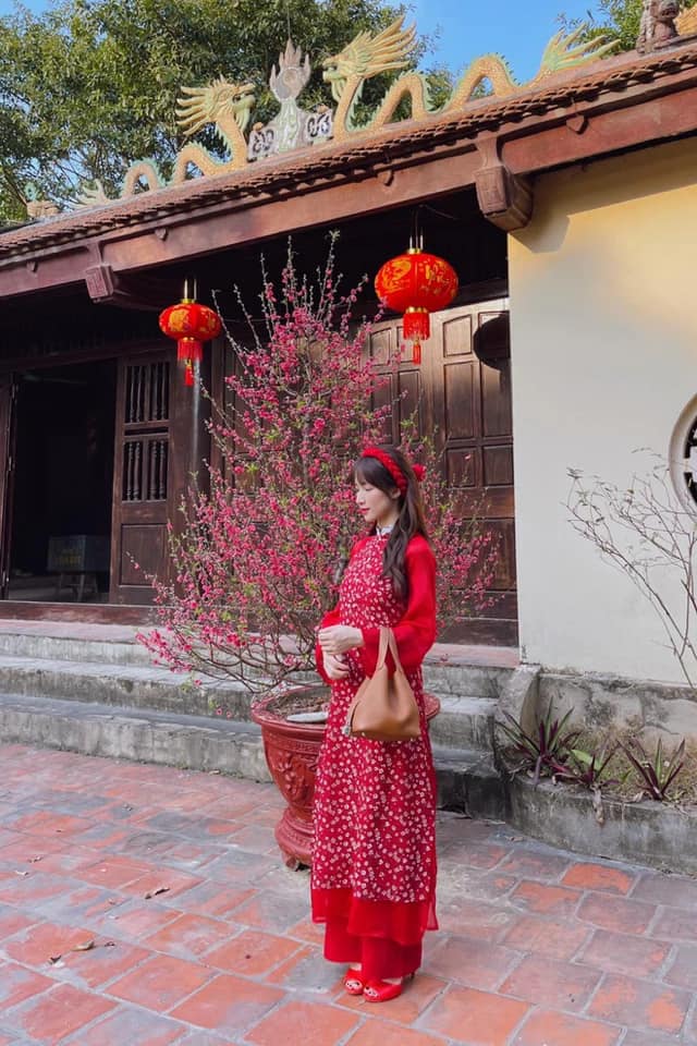Hòa Minzy nổi bật với áo dài màu đỏ hai tà. Cô còn phối với mấn và dép cao gót đồng điệu trông như bao lì xì.