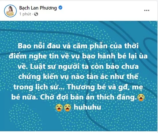 Trong khi đó, MC Bạch Lan Phương hay diễn viên Gia Bảo chờ đợi phiên tòa tới, cũng như bản án thích đáng cho kẻ đã gây ra nỗi đau cho bé V.A.