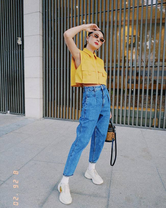 Phạm Thanh Hằng trông trẻ trung, nổi bần bật nhưng vẫn rất sang trọng với combo áo gilet mang tông màu vàng + quần jeans và sneaker trắng. Dù đi giày thấp, vóc dáng của Thanh Hằng vẫn không bị dìm. Cô đã khéo léo kết hợp áo dáng lửng với quần có độ dài trên mắt cá chân, đảm bảo vẻ cao ráo cho tổng thể.