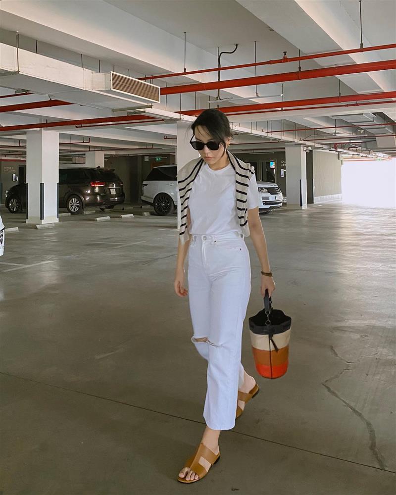 Set đồ gồm áo thun trắng + quần jeans xuyệt tông và dép lê của Hà Trúc quả là đẹp miễn chê. Những chi tiết như sơ vin, quần cạp cao và độ dài trên mắt cá chân đều góp phần quan trọng để hack dáng.