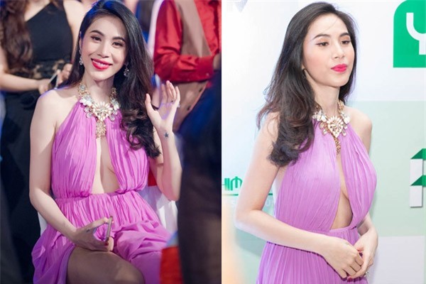 Thủy Tiên xuất hiện tại lễ trao giải VTV Awards được tổ chức tại SVĐ Quần Ngựa – Hà Nội. Ngay khi xuất hiện tại thảm đỏ, Thủy Tiên đã gây sốc khi diện một chiếc váy tím xẻ tà cực kỳ sexy, chiếc váy tím với thiết kế xẻ đùi cao, cùng phần ngực được cách tân từ kiểu dáng cổ yếm.