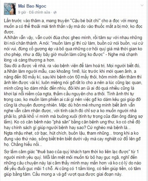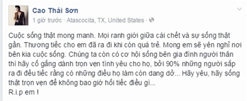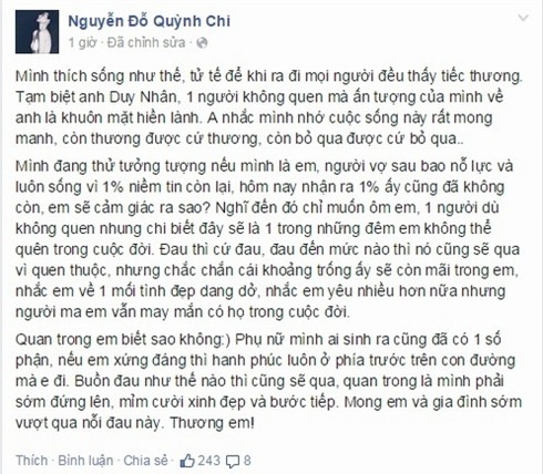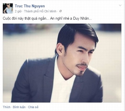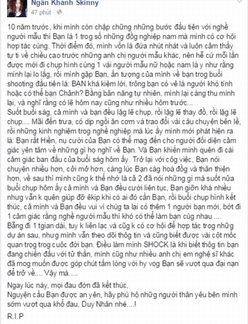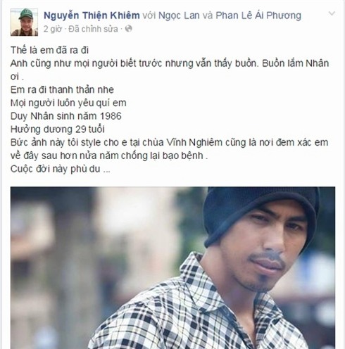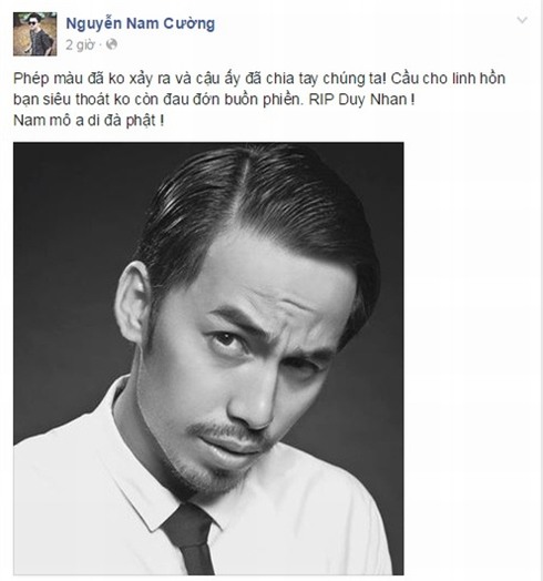 Cách đây vài giờ, Duy Nhân đã trút hơn thở cuối cùng sau khoảng thời gian dài chiến đấu với căn bệnh quái ác này. Ta đi trong sự tiếc nuối, rất nhiều đồng nghiệp đã viết những lời chia buồn lên trang cá nhân, chia sẻ về những kỷ niệm với Duy Nhân khi anh còn sống và làm nghề. Không ít những lời chia sẻ của các nghệ sỹ khiến khán giảm phải chạm lòng và khâm phục nghị lực sống của chàng diễn viên điển trai này.