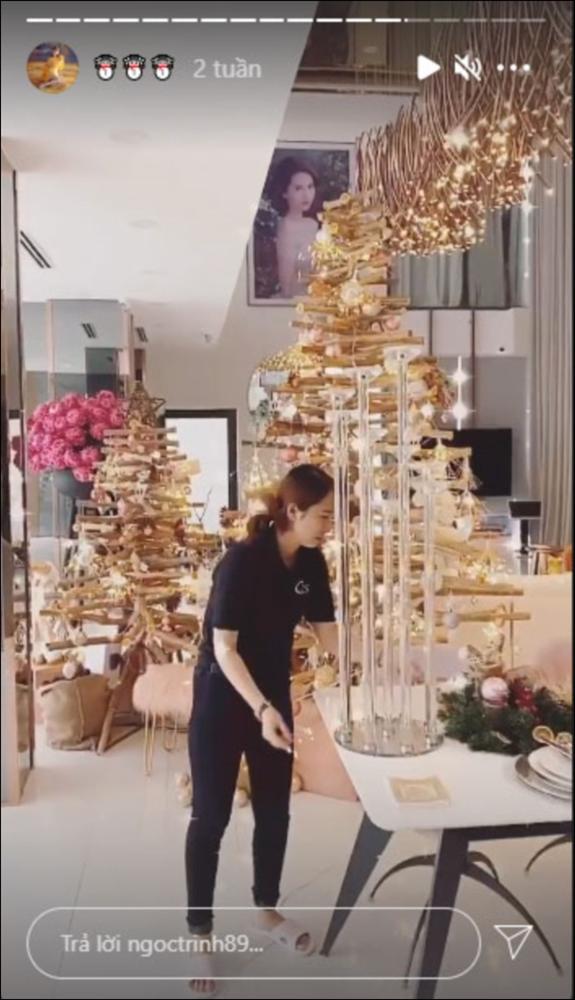 Là người sẵn sàng chịu chi số tiền lớn cho việc trang trí nhà cửa dịp Giáng sinh, Ngọc Trinh không chỉ sắm cây thông mà cô còn trang trí hết cả phòng khách, trần nhà, phòng ăn, cả ban công cũng được treo đèn trang trí. Noel năm nay cô chọn tông vàng vương giả là chủ đạo.