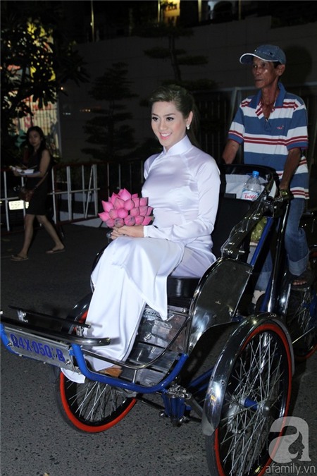 xích lô. Ca sĩ này còn diện áo dài trắng, mang hoa sen hồng, đeo bông