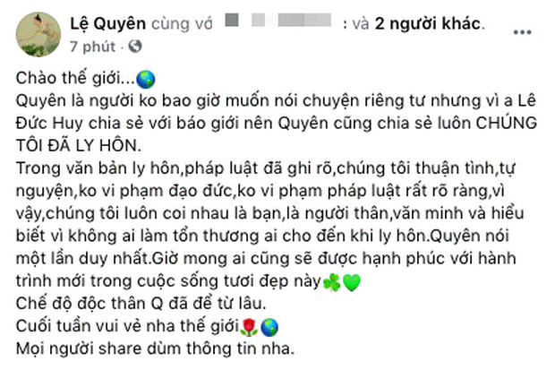 Lệ Quyên đăng bài viết xác nhận ly hôn chồng đại gia
