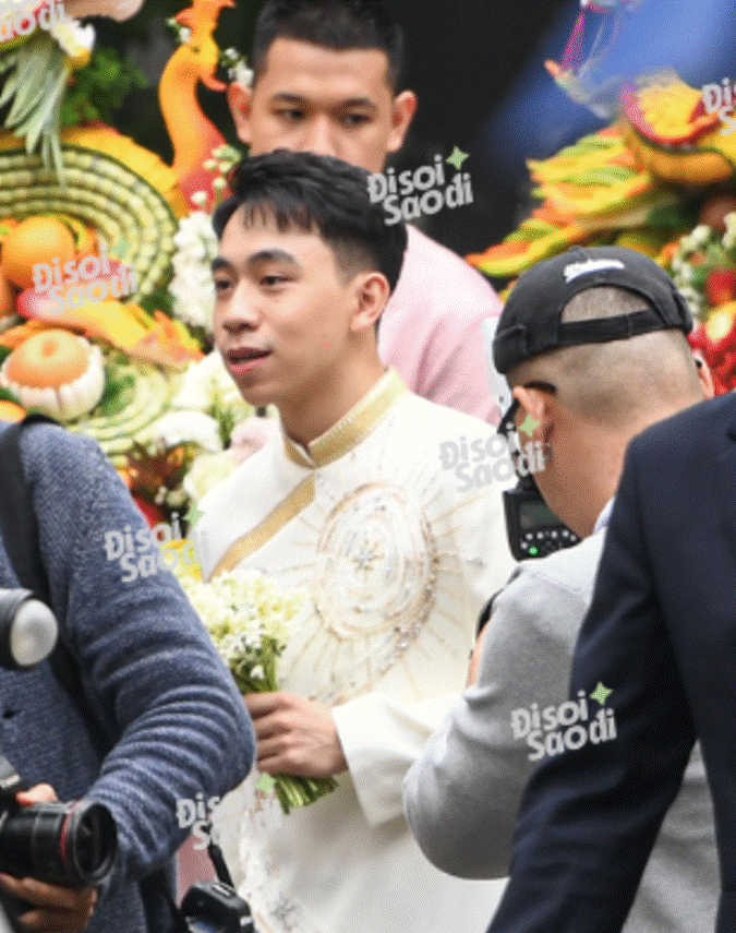 Ngay từ sáng sớm, phía gia đình nàng hậu đã tất bật hoàn thành nốt những công đoạn cuối cùng để tiếp đón nhà trai. Khoảng 8h, chú rể Phạm Nhật Minh Hoàng cùng bố mẹ và gia đình đã chính thức xuất hiện tại nhà cô dâu, mang theo dàn tráp lễ hoành tráng, thu hút mọi ánh nhìn. Cộng đồng mạng dành nhiều lời khen bởi nam thiếu gia sở hữu vẻ ngoài bảnh bao, diện áo dài trong ngày vui của mình.