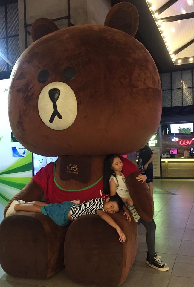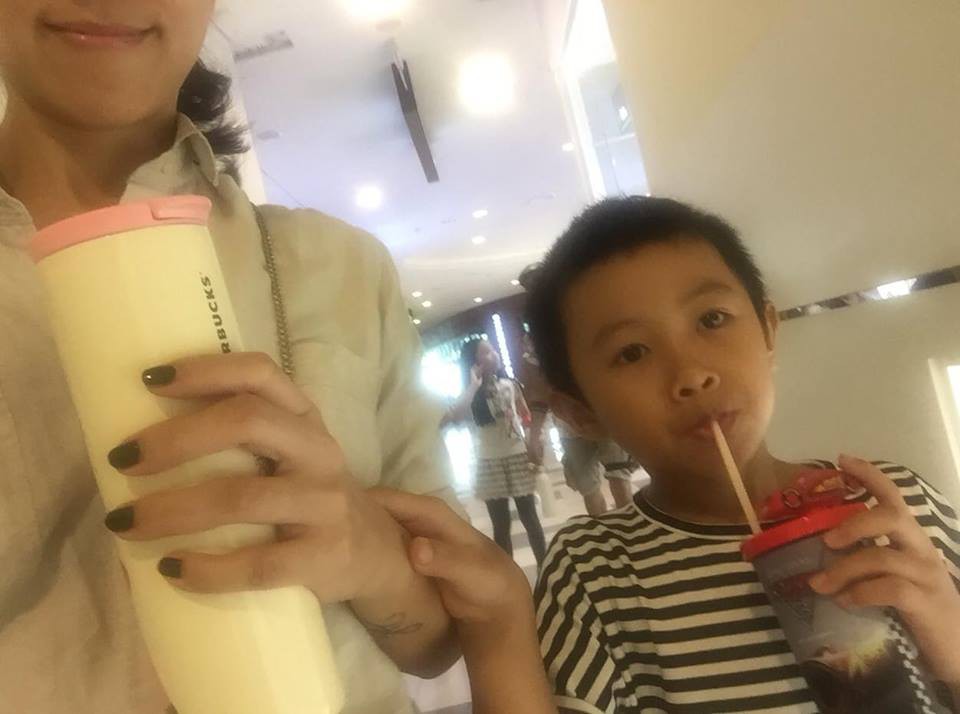 Hình ảnh Phạm Anh Khoa cùng con gái lấp ló phía sau Thùy Trang và con trai ở rạp chiếu phim.