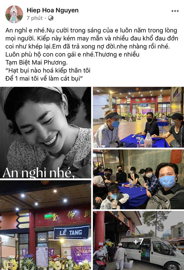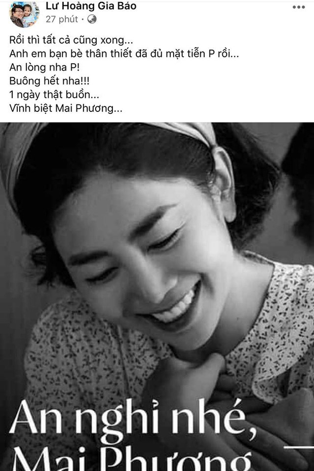 Sau khi tang lễ hoàn tất, nhiều bạn bè, đồng nghiệp đã chia sẻ những hình ảnh cuối cùng để tưởng nhớ và nói lời vĩnh biệt cố nghệ sĩ. "Rồi thì tất cả cũng xong. Anh em bạn bè thân thiết đã đủ mặt tiễn Phương rồi. An lòng nha Phương, buông hết nha. 1 ngày thật buồn, vĩnh biệt Mai Phương", Gia Bảo viết.