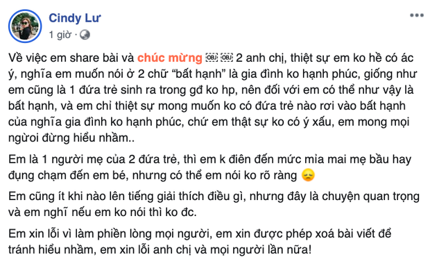 "Về việc em share bài và chúc mừng 2 anh chị, thiệt sự em không hề có ác ý, nghĩa em muốn nói ở 2 chữ "bất hạnh" là gia đình ko hạnh phúc, giống như em cũng là 1 đứa trẻ sinh ra trong gia đình không hạnh phúc, nên đối với em có thể như vậy là bất hạnh. Và em chỉ thật sự mong muốn không có đứa trẻ nào rơi vào bất hạnh của nghĩa gia đình không hạnh phúc, chứ em thật sự không có ý xấu, em mong mọi người đừng hiểu nhầm.