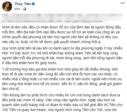 Nữ ca sĩ khẳng định bản thân không làm một cách tự phát “thích cho bao nhiêu thì cho”. “Dân vùng nào nghèo hơn, ngập sâu hơn và quanh năm suốt tháng chả có đoàn từ thiện nào có thể ghé đến thì Tiên cho 10 triệu. Tiên có quay livestream, mọi người nhìn vùng Tiên cho 10 triệu, vừa nói xong tất cả bà con 80% là bật khóc ngay tại chỗ vì họ quá khổ và như vớ được chiếc phao, Tiên cũng nhiều khi rớt nước mắt khi phát tiền vì nhìn họ sao mà thương quá”, Thủy Tiên tâm sự.
