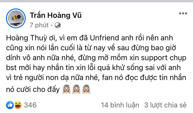Đến chiều nay (ngày 11/7), drama đã bùng lên đến mức "tức nước vỡ bờ", Milor Trần gọi thẳng tên Hoàng Thuỳ và xác nhận đã bị Á hậu Hoa hậu Hoàn vũ huỷ kết bạn. Đồng thời, vị nhiếp ảnh gia này còn lên tiếng "đằn mặt" và tuyên bố sẽ không hỗ trợ Hoàng Thuỳ trong bất kì công việc nào từ nay về sau. "Anh cũng xin nói lần cuối là từ nay về sau đừng bao giờ dính vô anh nữa nhé, đừng mở mồm xin hỗ trợ chụp bộ sưu tập mới hay nhắn tin xin lỗi quá khứ sống sai với anh vì trẻ người non dạ nữa nhé, fan nó đọc được tin nhắn nó cười cho đấy", Milor Trần chia sẻ.
