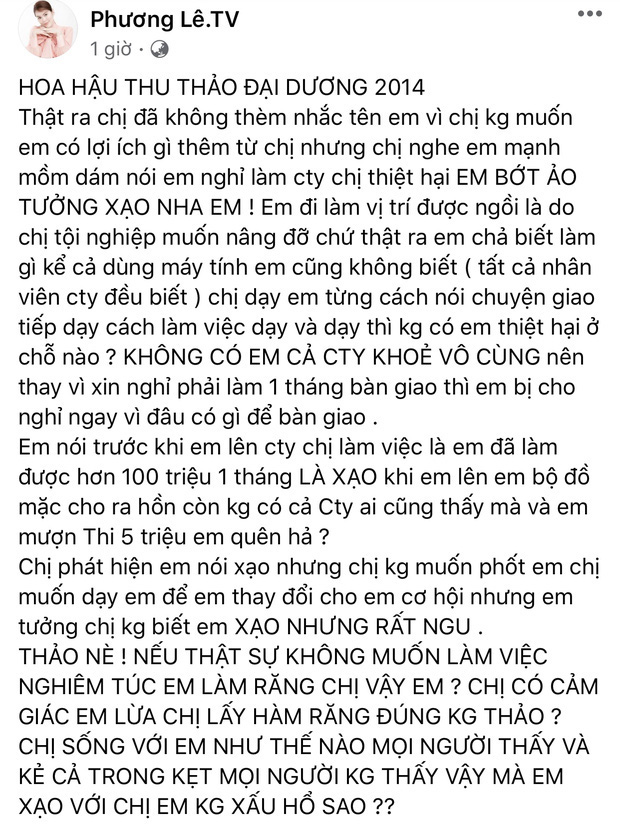 Bài đăng gay gắt tố Đặng Thu Thảo trước đó của Phương Lê