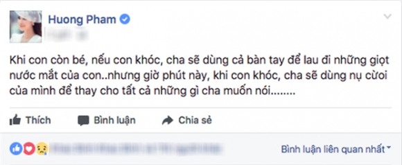 Tình hình sức khỏe bố của Phạm Hương vốn không tiến triển sau thời gian điều trị bệnh mặc dù đã tìm được nguồn máu hiếm hỗ trợ. Ngày h, sức khỏe của bố Hoa hậu chuyển biến xấu và bắt đầu có dấu hiệu hấp hối, được chuyển về nhà riêng. Ngay sau khi nhận được hung tin, Hoa hậu Phạm Hương đã tức tốc trở về Hải Phòng để gặp mặt và chăm sóc bố trong khoảng thời gian ngắn cuối đời này. Trên trang cá nhân của mình, Phạm Hương xúc động chia sẻ : "Khi con còn bé, nếu con khóc, cha sẽ dùng cả bàn tay để lau đi những giọt nước mắt của con. Nhưng giờ phút này, khi con khóc, cha sẽ dùng nụ cười của mình để thay cho tất cả những gì cha muốn nói".