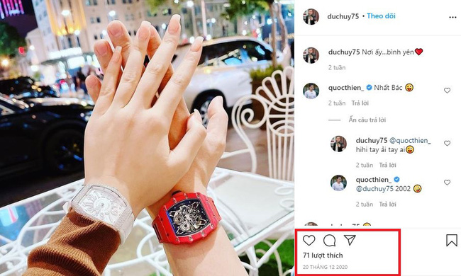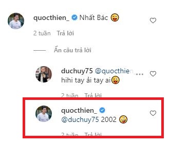 Thậm chí, trong phần bình luận, nam ca sĩ Quốc Thiên - người anh em thân thiết với doanh nhân Đức Huy còn công khai bình luận '2002'- năm sinh của Cẩm Đan. Theo nhiều người, có vẻ như bạn bè của doanh nhân Đức Huy đều biết về mối quan hệ thân thiết của anh và người đẹp sinh năm 2002 Cẩm Đan.