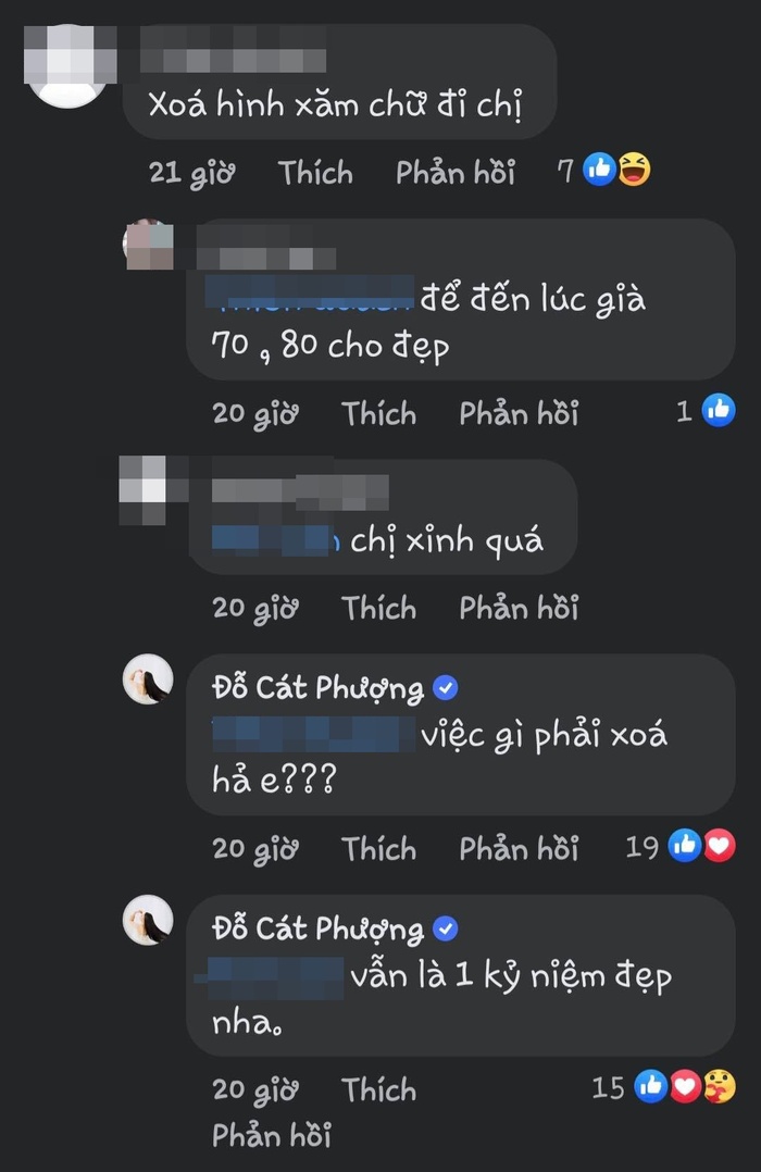 Trong bức hình mới đây, Cát Phượng thoải mái để lộ hình xăm ở cổ tay với hai chữ Cát Kiều được xăm nghệ thuật. Ngay dưới bài đăng, không ít người để lại lời động viên tới nữ diễn viên. Bên cạnh đó, có tài khoản để lại dòng bình luận: "Xóa hình xăm chữ đi chị". Tưởng chừng cô sẽ chọn cách ngó lớ nhưng Cát Phượng liền trả lời luôn rằng: "Việc gì phải xóa hả em. Vẫn là một kỷ niệm đẹp nha. Chị ổn".