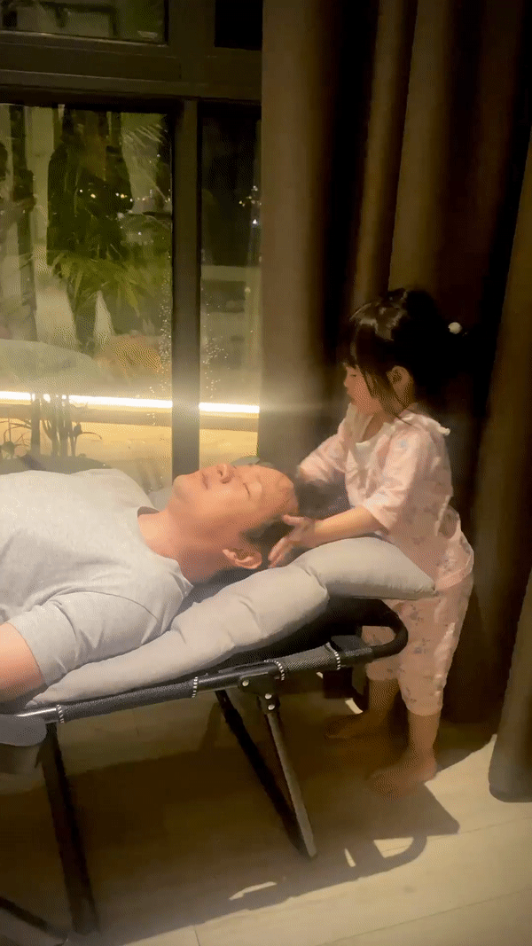 Mới đây, doanh nhân Trung Tín - ông xã của Hoa hậu Đặng Thu Thảo đã chia sẻ lên trang cá nhân đoạn clip con gái Sophie mát xa đầu cho mình. Ông xã "thần tiên tỷ tỷ" đang thư giãn và thoải mái vì được con gái giúp xua tan mệt mỏi sau một ngày làm việc.