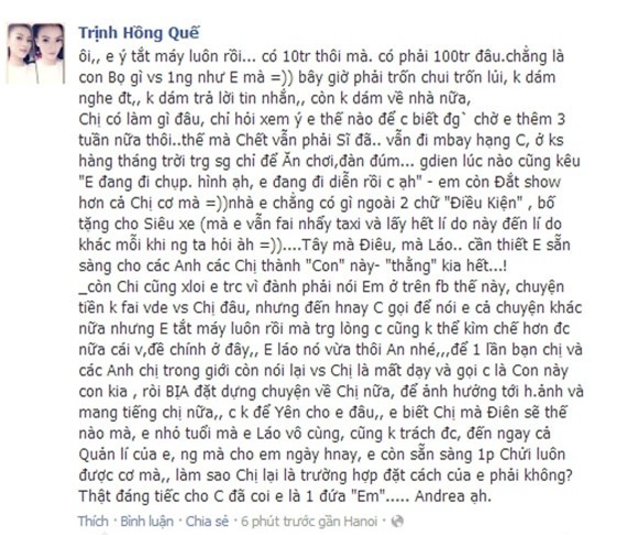 Người mẫu này cũng từng bị Hồng Quế mượn tiền nhưng trốn chui trốn lủi.