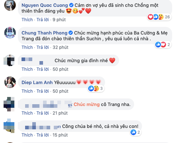 Mới đây, Đàm Thu Trang còn chính thức lộ diện sau khi sinh nở, có thể thấy "mẹ bỉm" vẫn giữ được thần sắc tươi tắn, mỉm cười hạnh phúc khi nhìn thiên thần nhỏ. Không giấu được niềm hạnh phúc khi được lên thiên chức, cô chia sẻ: "Cả nhà yêu con, Suchin của mẹ". Ngay dưới phần bình luận, "đại gia phố núi" cùng để lại lời nhắn xúc động: "Cảm ơn vợ yêu đã sinh cho chồng một thiên thần đáng yêu", khiến dân tình rần rần.