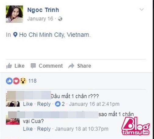 Ai cũng biết Ngọc Trinh sở hữu các số đo và tỷ lệ thân hình chuẩn. Mỗi khi mặc sexy xuất hiện tại sự kiện thì các khách mời cũng phải lác mắt. Ấy vậy mà đẹp chừng đó vẫn chưa đủ đối với Nữ hoàng nội y, chính vì thế mà cô đã nhiều lần phải nhờ đến photoshop. Tuy nhiên vì quá lạm dụng mà thân hình cô còn bị biến dạng hẳn, nhiều lúc còn bị khuyết cả bộ phận. Mới đây, cô nàng đăng bức ảnh mặc váy đen đẹp miễn chê, gương mặt trong sáng như thiên thần. Tuy nhiên lúc nhìn xuống phía dưới thì ai cũng toá hoả vì Ngọc Trinh bị mất luôn 1 bên chân! Trước đó người đẹp này đã từng muối mặt vì vướng sự cố tương tự.