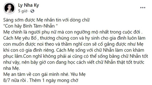 Sau khi bị réo tên vào lùm xùm không đáng có, dù không trực tiếp lên tiếng đính chính nhưng Lý Nhã Kỳ vẫn gây xôn xao MXH và được đông đảo khán giả động viên, ủng hộ khi đăng tải một dòng trạng thái đầy ẩn ý. Người đẹp cho biết mình đã nhận được dòng tin nhắn của mẹ với nội dung: "Con hãy bình tâm - nhẫn". Cũng chính vì thế mà cô cũng đang cố gắng học các nhẫn nhịn thật tốt theo như lời của mẹ giữa lúc bị réo gọi vào thị phi không đáng có.