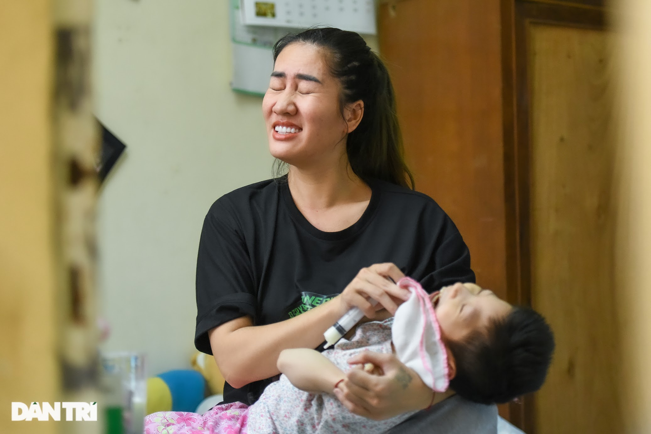 Minh Cúc phải dùng xi-lanh bơm trực tiếp từng ống sữa vào miệng của con. Em bé cũng rất dễ bị sặc nên phải bơm từng chút, từng chút một. Thậm chí, chị còn phải lựa những lúc Tú Minh chịu mở miệng, bơm thật nhanh một miếng sữa để con có thể nuốt vào.