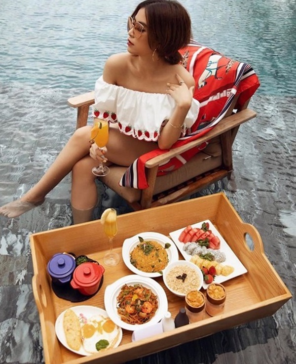 Bên cạnh sự xinh đẹp và sang chảnh, cư dân mạng còn tìm ra điểm đáng ngờ trong những bức hình được Hoàng Thùy Linh đăng tải. Cư dân mạng cho rằng, Hoàng Thùy Linh ngồi một mình trên bể bơi nhưng trên khay đồ lại có hai ly nước, thức ăn cũng có hai phần. "Em thấy rồi nhá, ngồi một mình, mà nước thì hai ly", "hai phần ăn nha", cư dân mạng bình luận.
