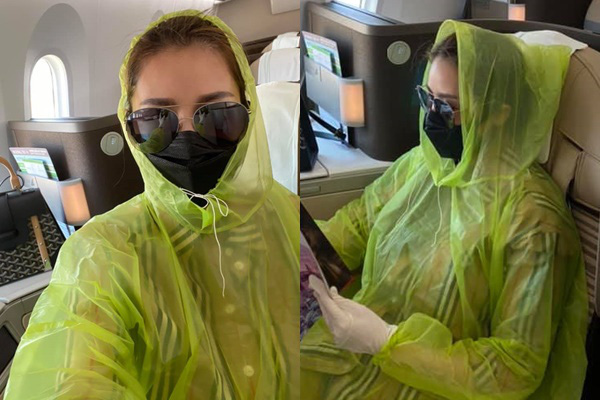 Quế Vân mặc áo mưa trên máy bay vì sợ nhiễm COVID-19.