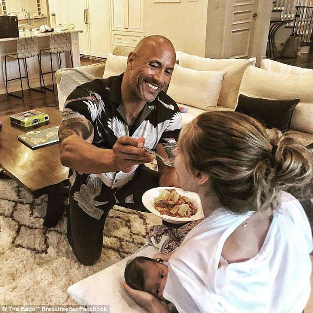 Khi cô con gái út Tiana Gia chào đời, Dwayne Johnson túc trực bên vợ cả ngày, động viên, chăm sóc cô từng li từng tí. Hình ảnh siêu sao cơ xúc đồ ăn cho vợ trong khi cô đang cho con bú từng khiến nhiều người xúc động.