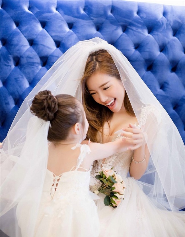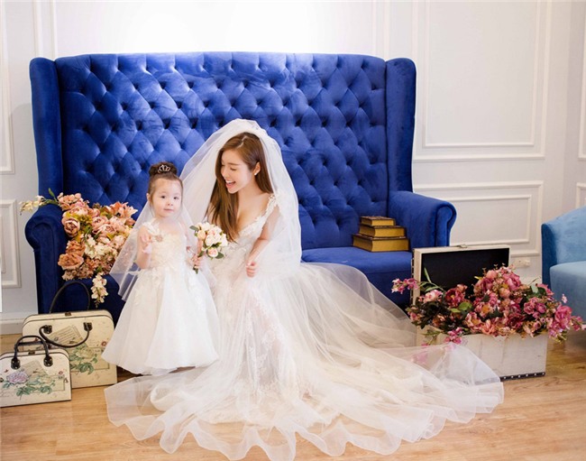 Chất liệu voan cùng ren được kết hợp hài hòa với tùng váy rộng, trông Elly như hóa thân thành một công nương xinh đẹp cùng con gái đáng yêu tỏa sáng trong ngày cưới.
