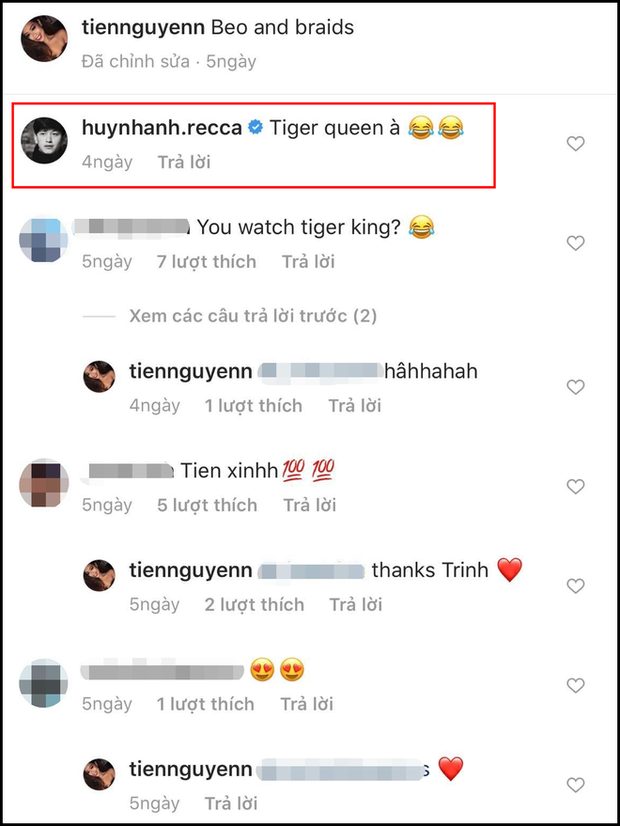Không chỉ có Bâu, Tiên Nguyễn cũng là một trong những người đẹp thường xuyên nhận được những động thái tương tác tích cực từ phía Huỳnh Anh. Đặc biệt, trong một bức ảnh từ đầu năm, Huỳnh Anh đã "bay" vào comment dưới bức hình của Tiên Nguyễn: "Tiger queen à?" (Tạm dịch: Nữ hoàng hổ à?). Tuy nhiên, Tiên Nguyễn chẳng mảy may để ý đến bình luận của nam diễn viên dù tick xanh nổi bần bật. Thay vào đó cô nàng lại cực nhiệt tình trả lời, trêu đùa bạn bè.
