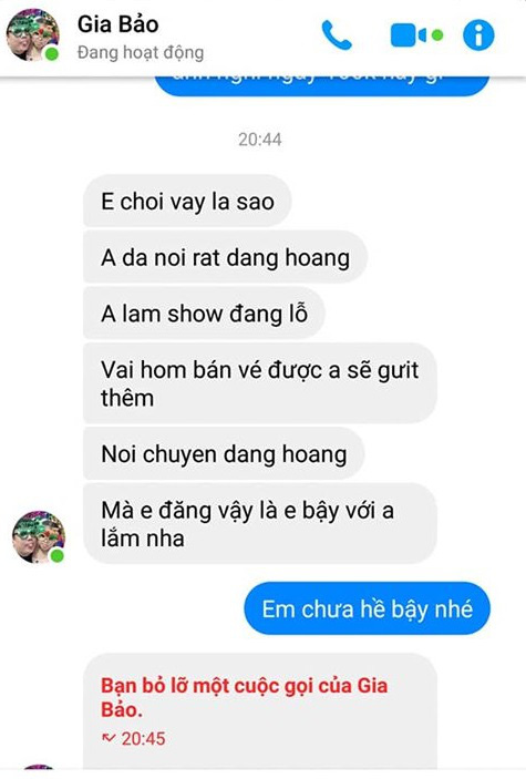 Trong đoạn tin nhắn có thể thấy, Gia Bảo liên tục dùng thái độ thiếu hòa nhã khi nói chuyện với người này. "Còn chưa nói... làm việc tào lao nha... đang nợ mọi người rất nhiều, đang cố gắng để giải quyết. Lát... sẽ chuyển", những dòng tin nhắn vô cùng cộc cằn.