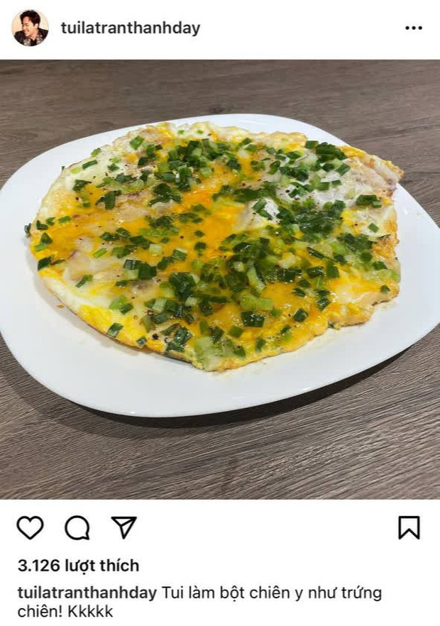 Thay vì đó, anh thể hiện tinh thần tích cực, cập nhật ảnh hoạt động thường ngày khi khoe đồ ăn tự làm. "Tui làm bột chiên trứng y như trứng chiên", Trấn Thành hào hứng.