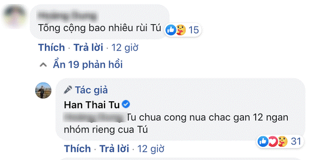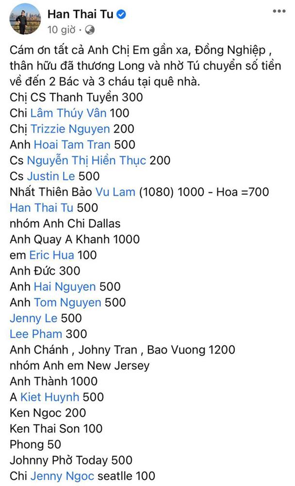 Dưới phần bình luận, Hàn Thái Tú chia sẻ hiện tại con số đang nằm ở khoảng 12.000 USD (tương đương 300 triệu đồng). Đây chỉ là số tiền từ phía ca sĩ Hàn Thái Tú tổng kết. Nam ca sĩ cho biết thêm rằng con số vẫn đang tiếp tục tăng lên. "Cám ơn tất cả anh chị em gần xa, đồng nghiệp, thân hữu đã thương Long và nhờ Tú chuyển số tiền về đến 2 Bác và 3 cháu tại quê nhà", Hàn Thái Tú chia sẻ.