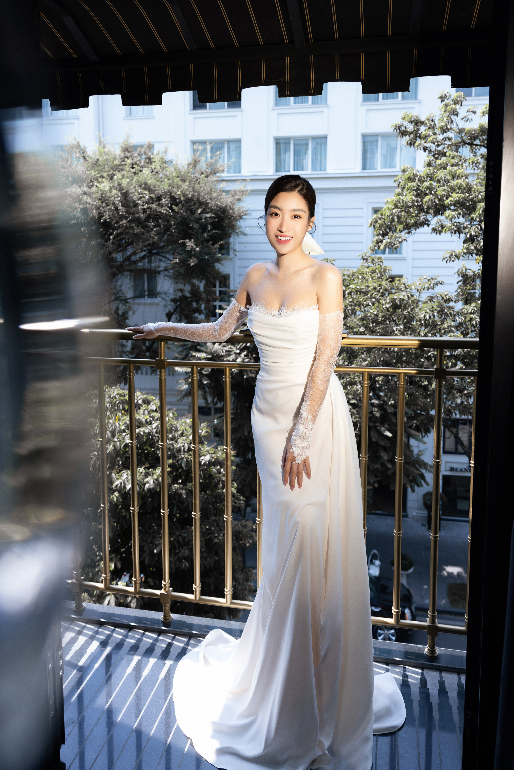 Sau lễ rước dâu chiều 23/10, Đỗ Mỹ Linh có mặt từ sớm tại địa điểm diễn ra lễ cưới để trang điểm, sẵn sàng đón khách. Hoa hậu Việt Nam 2016 diện váy trắng cúp ngực trắng, phối ren cùng lối trang điểm nhẹ nhàng, tóc túm gọn phía sau nền nã.