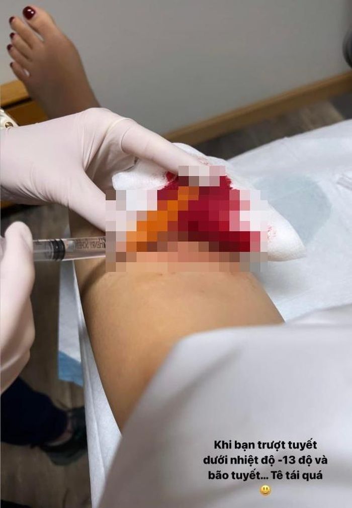 "Khi bạn trượt tuyết dưới nhiệt độ -13 độ và bão tuyết. Tê tái quá", Phạm Hương viết kèm hình ảnh can thiệp y tế.