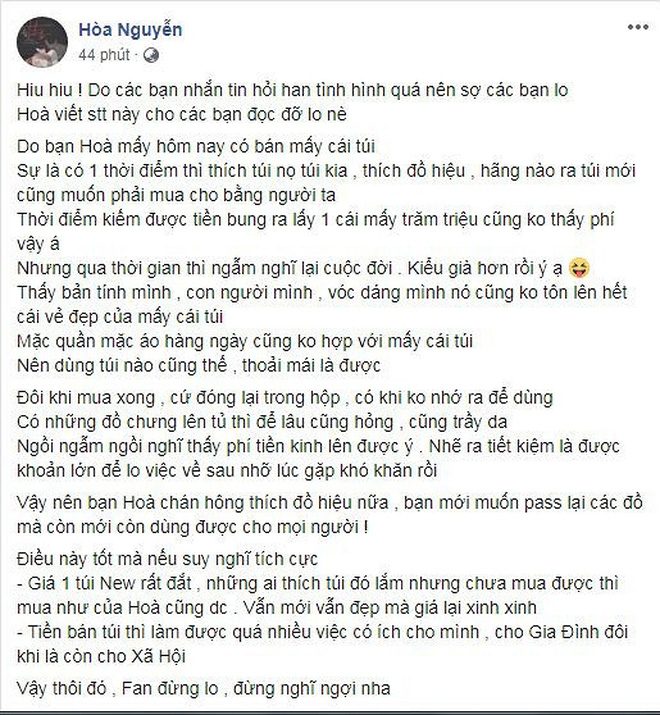Bài đăng giải thích về vấn đề bán túi của Hòa Minzy vào năm ngoái.