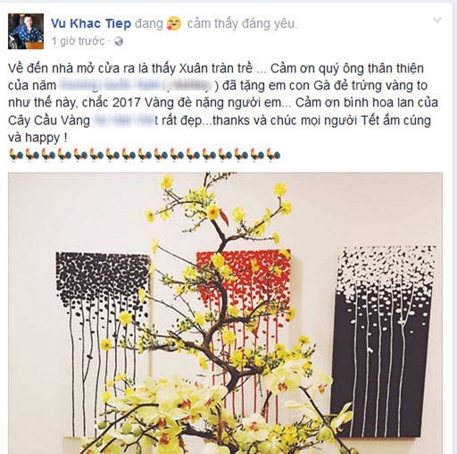 Trong khi đó, ông bầu Vũ Khắc Tiệp cám ơn hai người bạn thân vì món quà giá trị ngày Tết là con gà đẻ trứng vàng và bình hoa lan, kèm theo đó là trạng thái cảm thấy đáng yêu.