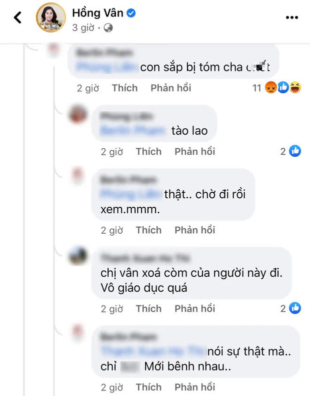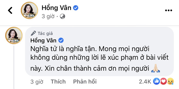 Đáng chú ý, dưới bài đăng của Hồng Vân, rất nhiều cư dân mạng để lại bình luận chê trách Hoài Linh nặng nề và còn phát ngôn liên quan tới bố ruột nam nghệ sĩ. Trước hành động đó của antifan, Hồng Vân đã lên tiếng bảo vệ hai cha con nghệ sĩ Hoài Linh: "Nghĩa tử là nghĩa tận. Mong mọi người không dùng những lời lẽ xúc phạm ở bài viết này. Xin chân thành cảm ơn mọi người".